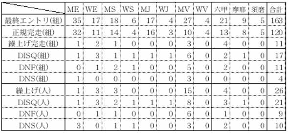 ウムスタートにかかった者が多数ありました。一般クラスの六甲/摩耶/須磨は選手権クラスのMV/WS・WJ/WVとそれぞれ同じコースだったので、下の表でMVと六甲を重ねると、この2クラスがいかに荒れたかがはっきり読み取れることでしょう。